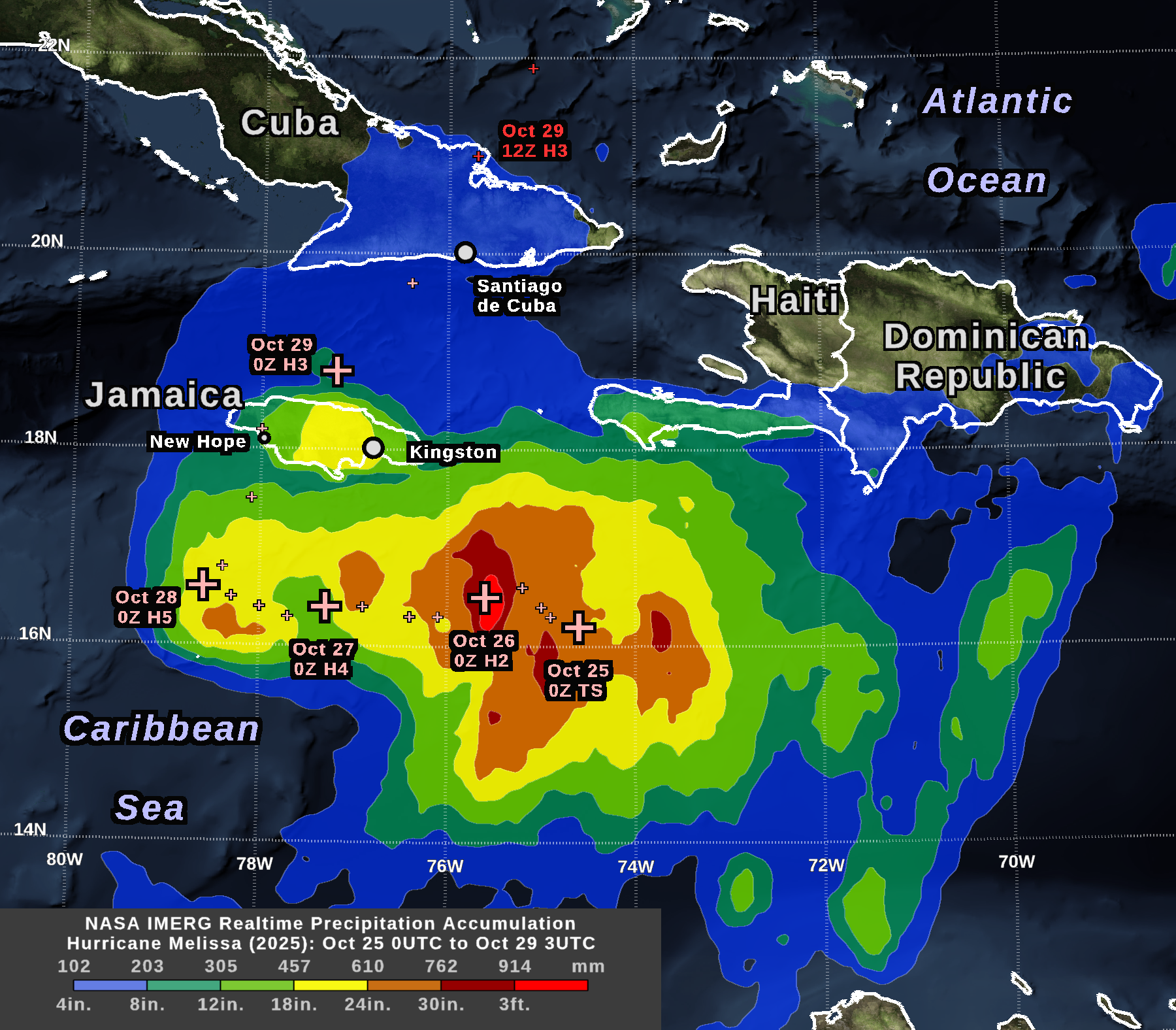 During the preceding 48 hours, the center of Hurricane Melissa had stayed about 100 km south of Jamaica while it strengthened from category 2 to 5 and traveled slowly west. The plus signs in the accumulation image indicate the NHC’s estimate of the location of Hurricane Melissa’s eye every six hours.