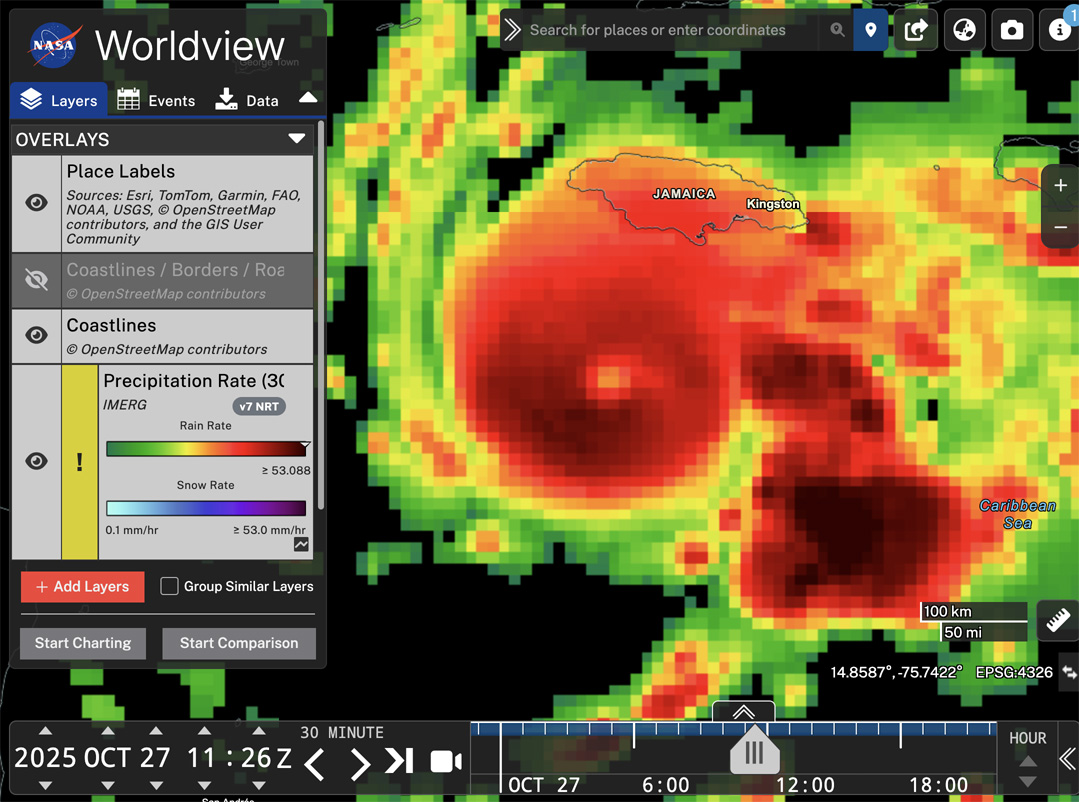 In the image above, this persistent stormy area east of Melissa is indicated with the arrow in the 30-minute precipitation-rate image. This image was captured from NASA’s Worldview web page. This image shows data from 16 hours before Melissa made landfall in Jamaica at approximately 1PM EDT (1700 UTC on October 28) according to the National Hurricane Center. You can view a higher resolution version of this image here or interactively explore this data by following this link to Worldview.